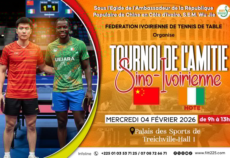 Le sport au service de la coopération internationale Fruit d’une collaboration étroite entre la Fédération Ivoirienne de Tennis de Table (FITT), l’Ambassade de la République Populaire de Chine et la Chambre de Commerce des Entreprises Chinoises en Côte d’Ivoire (CCEC-CI), ce tournoi marque une étape clé dans l'agenda diplomatique et sportif de l'année 2026.